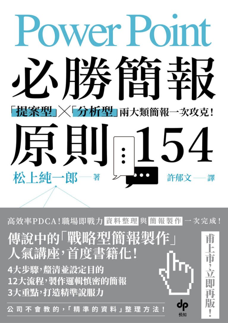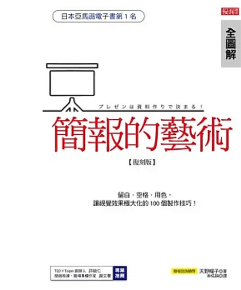 書中內容不僅針對簡報的技巧面,例如內容結構、視覺設計和表達方式,還重視心理層面的建設,例如克服舞台恐懼、與觀眾建立聯繫等。對於希望提升簡報技巧、在專業場合中展現自信與影響力的讀者來說,是本不可或缺的實用指南。了解更多…
