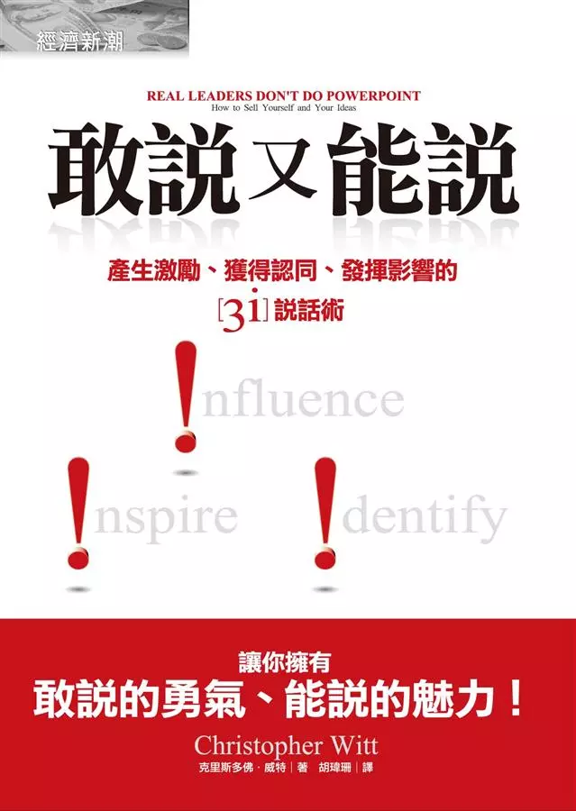 真正的領導者發言時,會推廣某個觀點,讓人們思考、感受和行動,達到獲得認同(identity)、產生激勵(inspire)、發揮影響(influence)的目的,這就是能讓簡報順利與演說成功的3i說話術。同時也要掌握三個原則:訊息就是要展現你自己+內容為主,技巧為輔+勇於嘗試,你將會發現你能揮更大的影響力。