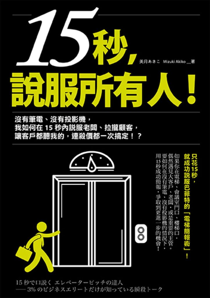 《15秒,說服所有人》揭示了迅速有效地打動他人的方法,尤其在短時間內捕捉聽者注意力。書中提出GTC筆記法,協助簡潔準確地表達主題,包含目標、目標對象、及連接途徑。